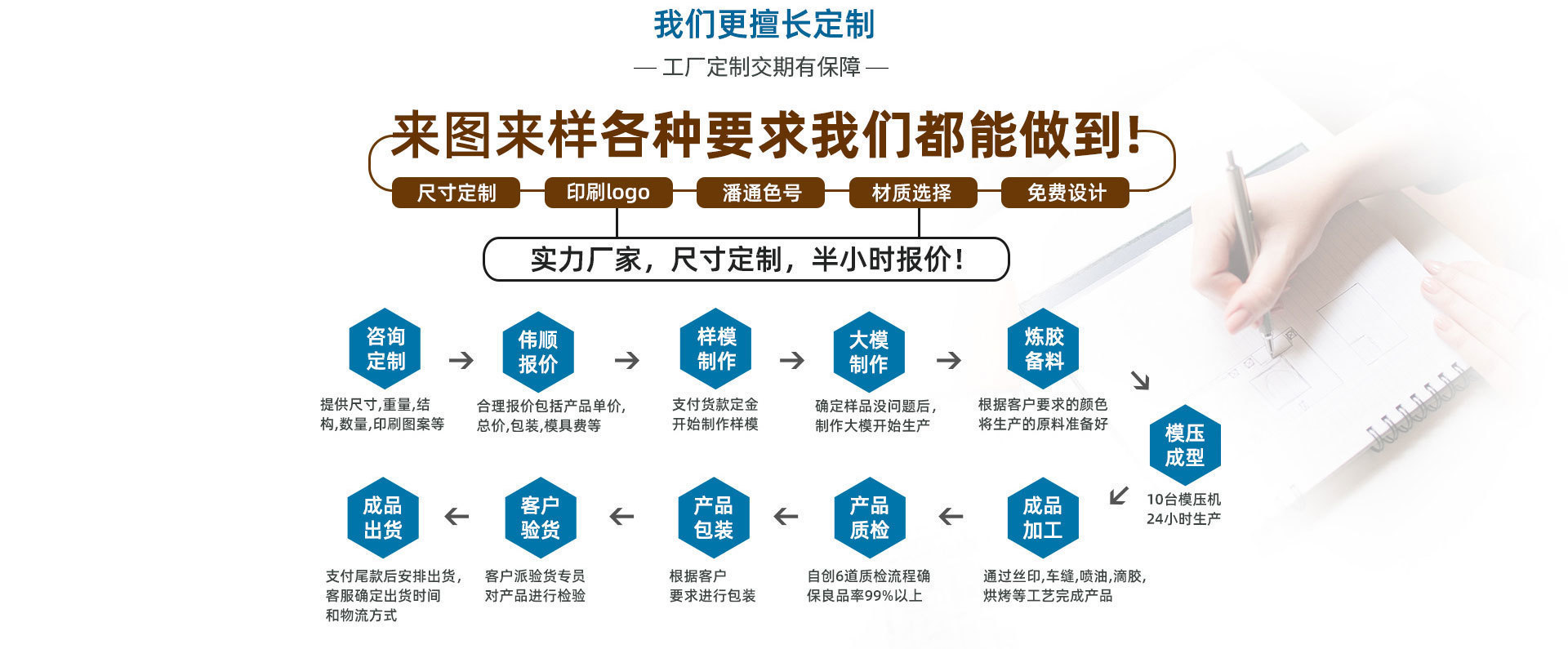 東莞偉順是一家自營生產(chǎn)、設(shè)計、研發(fā)、銷售為一體的民營東莞硅膠制品廠家,自有3000平米的生產(chǎn)基地,員工一百多人,月產(chǎn)硅膠制品20萬件,硅膠廚具生產(chǎn)廠家擁有完整的設(shè)備設(shè)施,20臺硅膠平板硫化機設(shè)備,硅膠套量產(chǎn)能力強大,質(zhì)量保證。