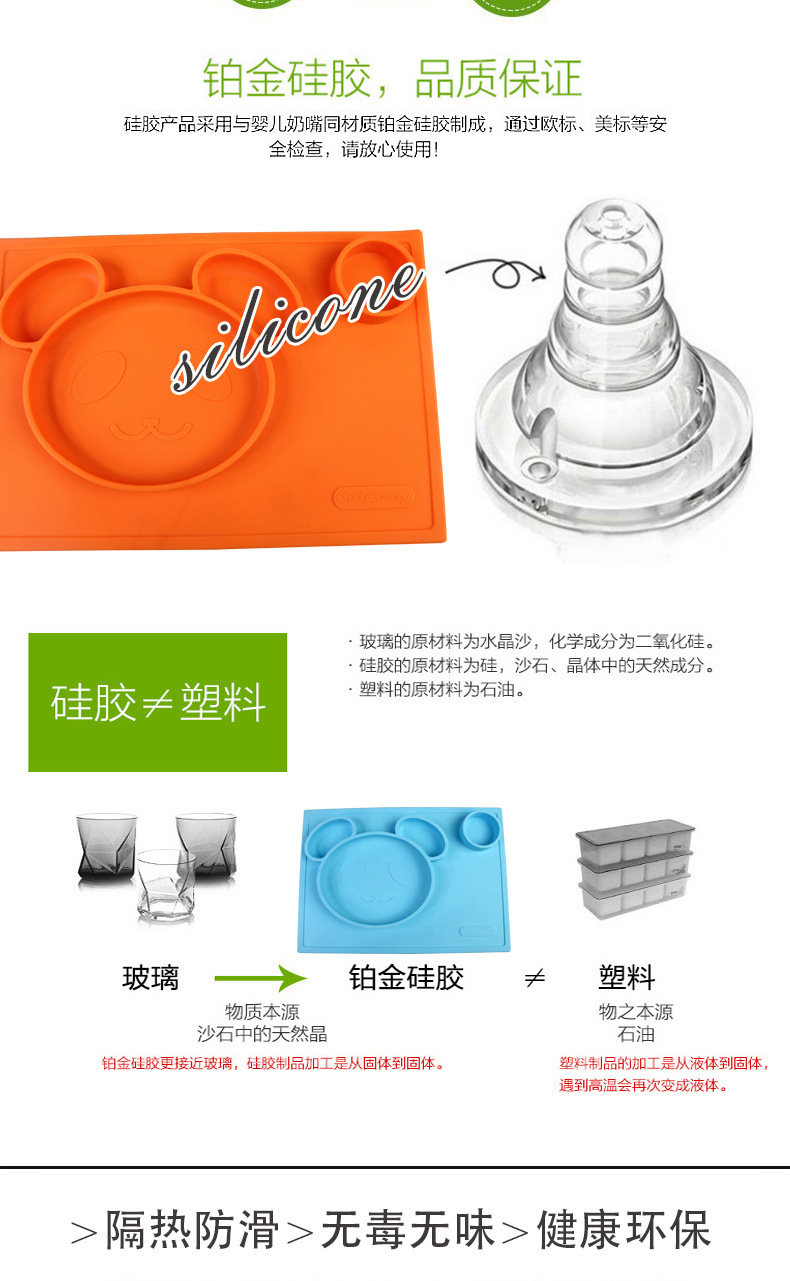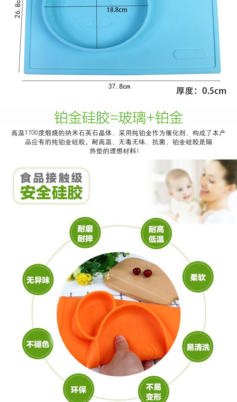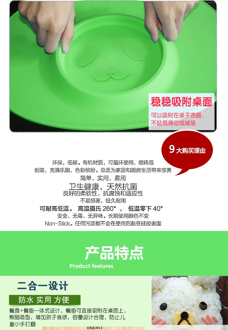 特點:二合一設(shè)計,防水、實用、方便,餐盤+餐墊一體式設(shè)計,餐墊可直接吸附在桌面上,熊貓造型,增加孩子的食欲,容量設(shè)計合理,防止兒童小手打翻。