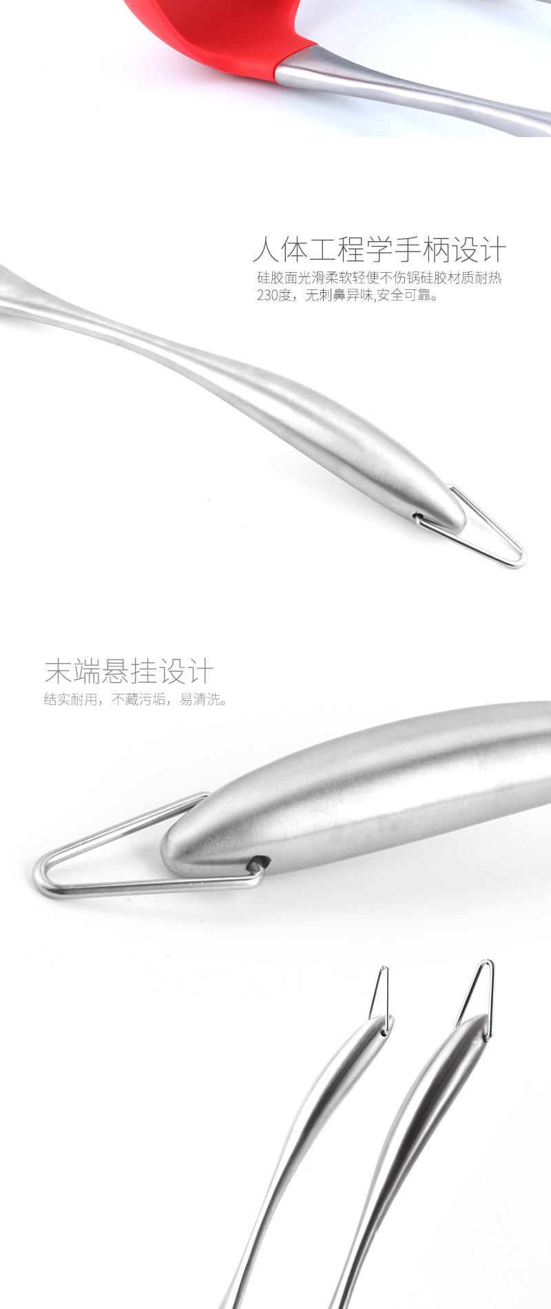 2、人體工程學(xué)手柄設(shè)計(jì),硅膠面光滑柔軟輕便不傷鍋,硅膠材質(zhì)耐熱250℃,無刺鼻異味,安全可靠
