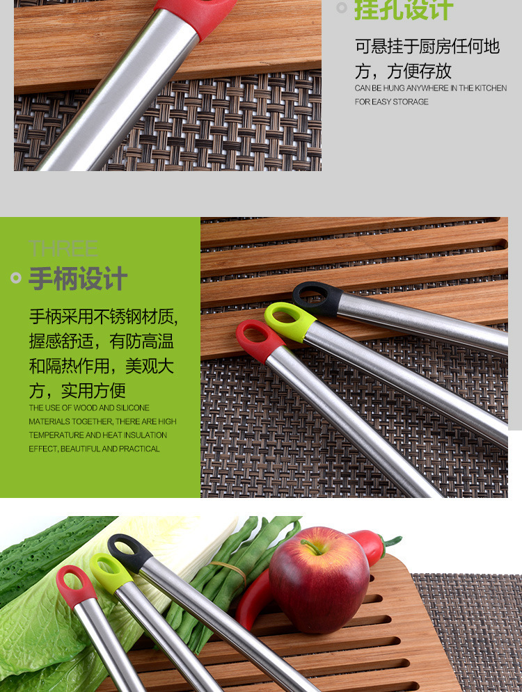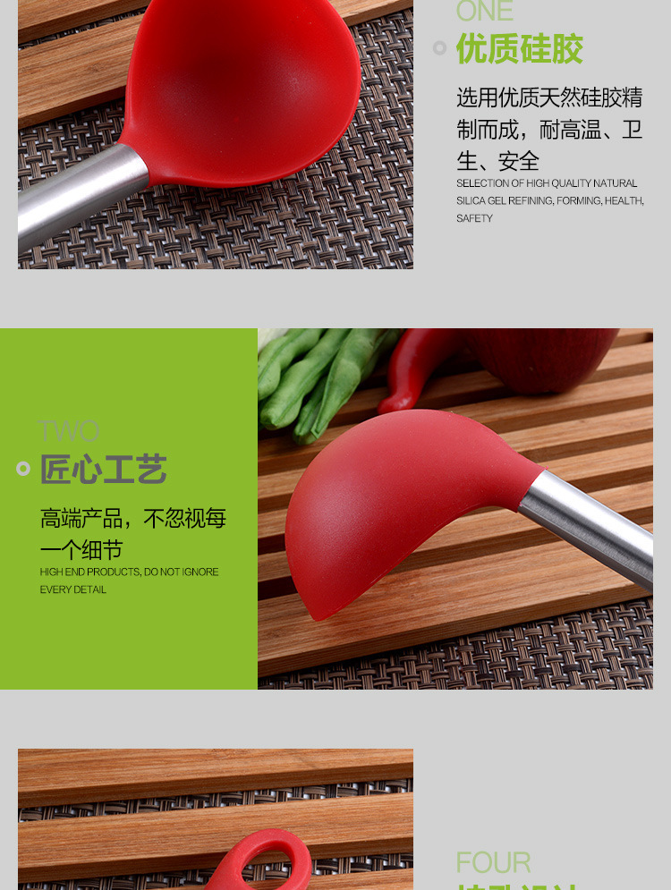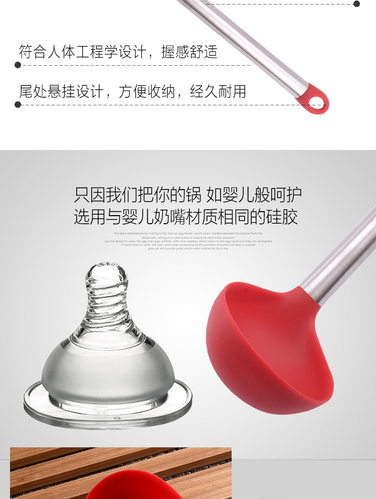 1、這件硅膠廚具完美的適用于家庭廚房,安全環(huán)保耐用,很好的保護了不粘鍋的涂層,減少摩擦,也打破廚房用品顏色單一選擇,讓廚房時光更加美好