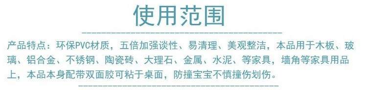 【適用范圍】: 安全又美觀,即讓寶寶和您的家人免受碰撞之苦,同時又不妨礙家具整體造型。適用于一般家庭中的桌角/床角/書柜/玻璃茶幾/樓梯角等容易產(chǎn)生危險的位置